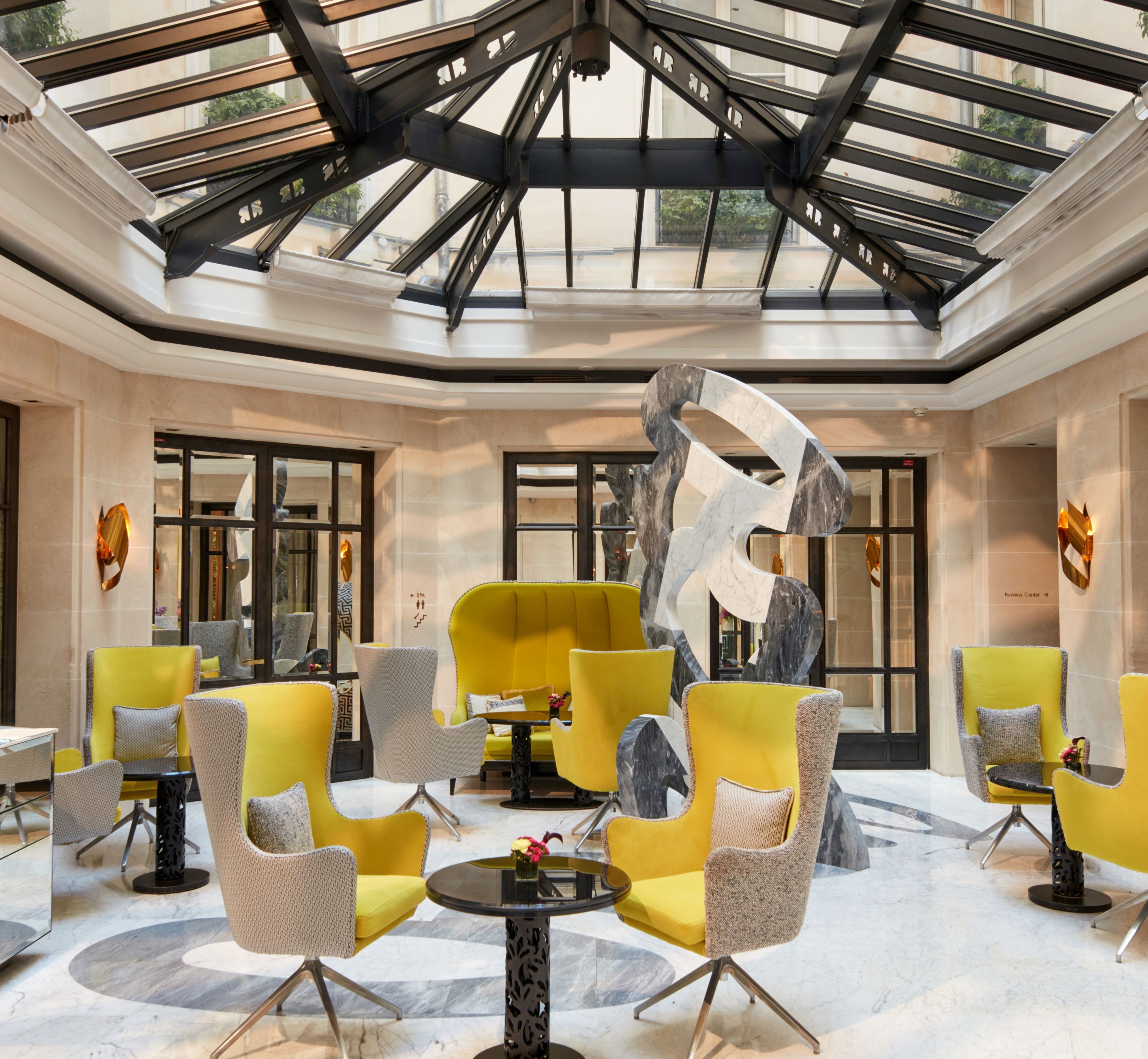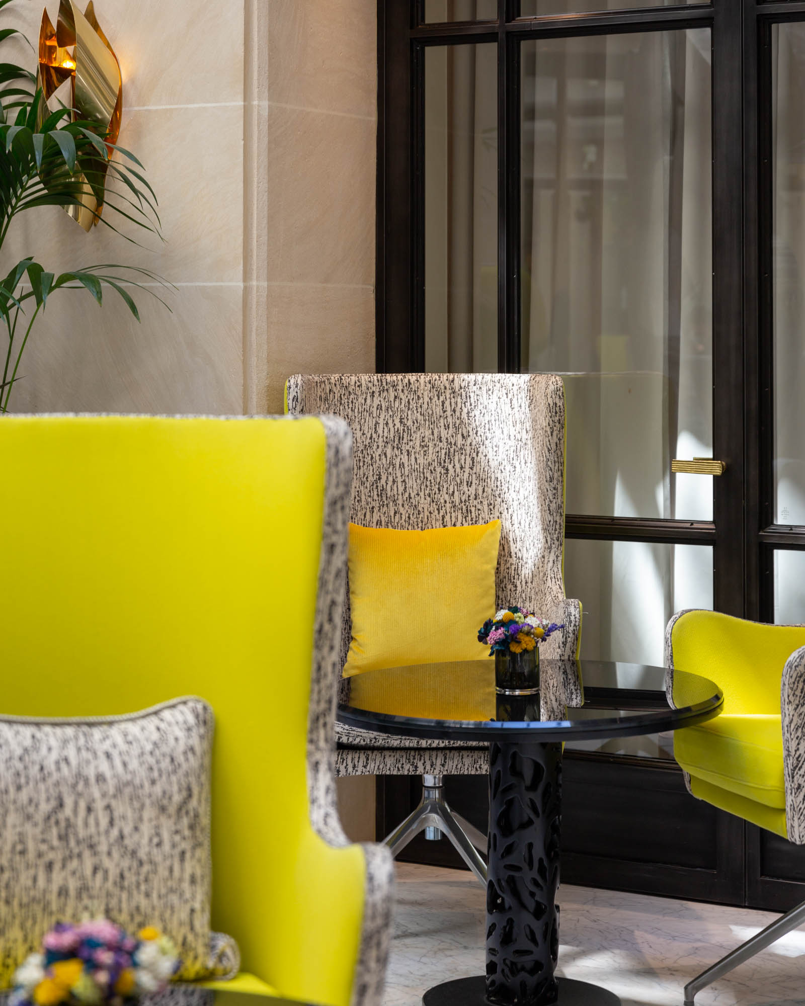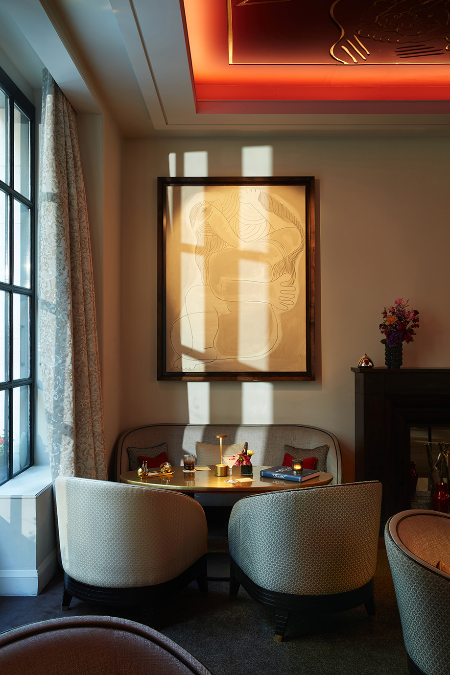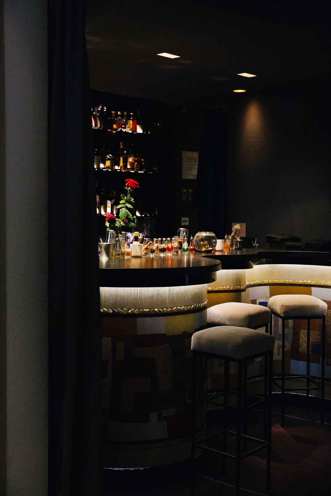 Le Bar affirme sa propre identité à travers un décor éclectique et feutré, signé Patrick Juliot. Dédié au poète romantique Charles Baudelaire, il rend hommage à son œuvre majeure, Les Fleurs du Mal, célébrée au plafond par une fresque monumentale de l’artiste Marco Del Re. Quatre toiles du même artiste, inspirées des muses du poète, ornent les murs et prolongent ce dialogue entre littérature et art.