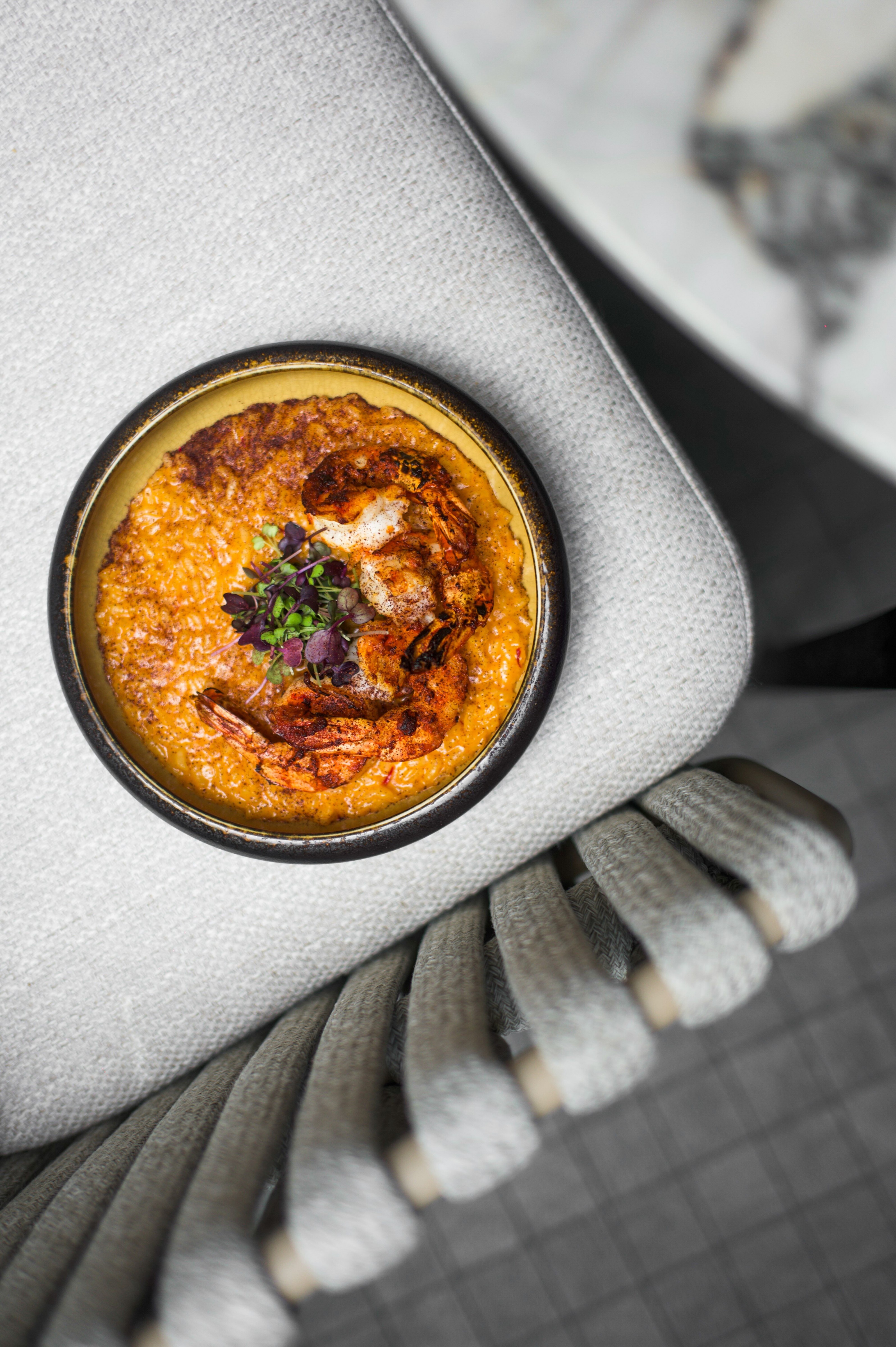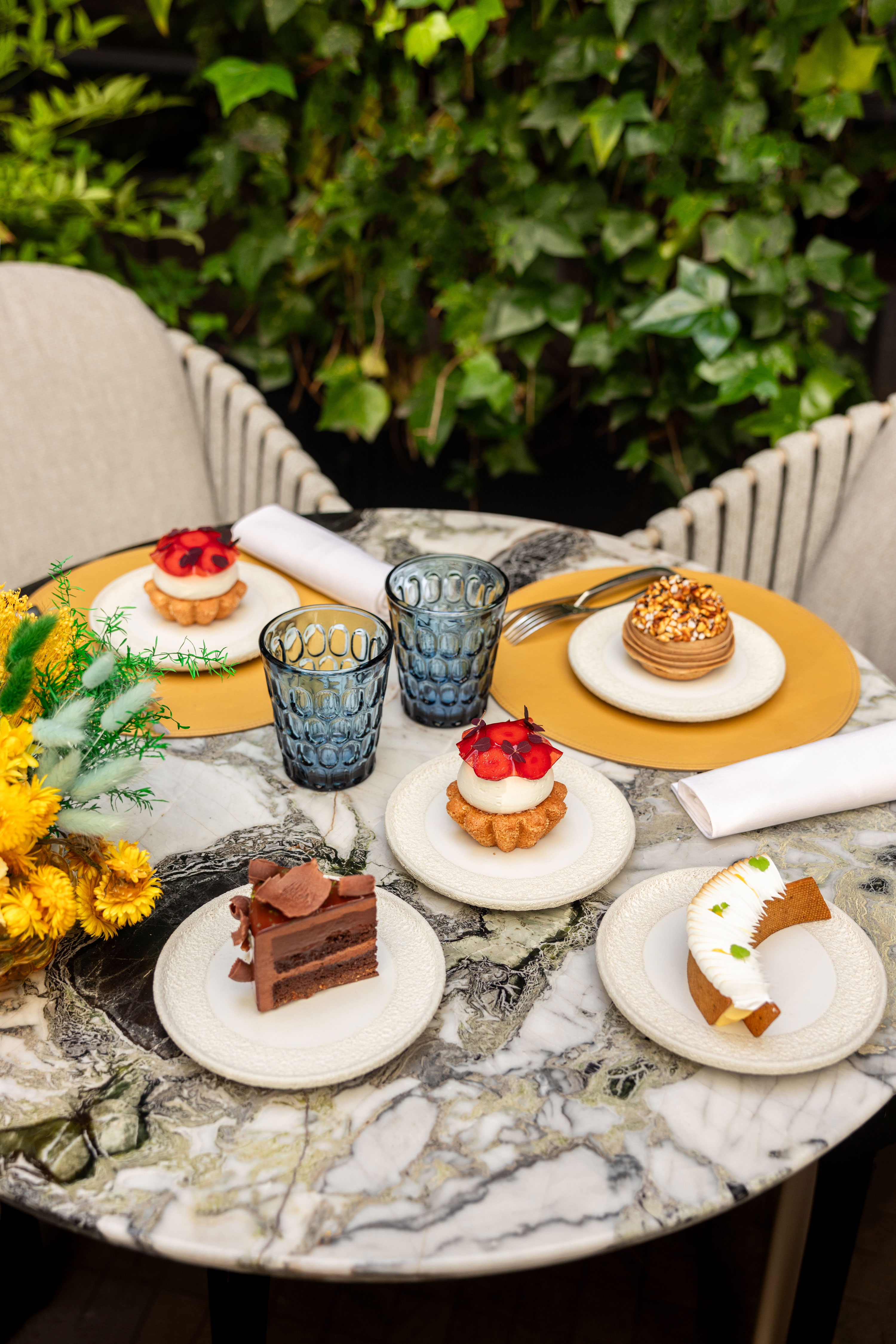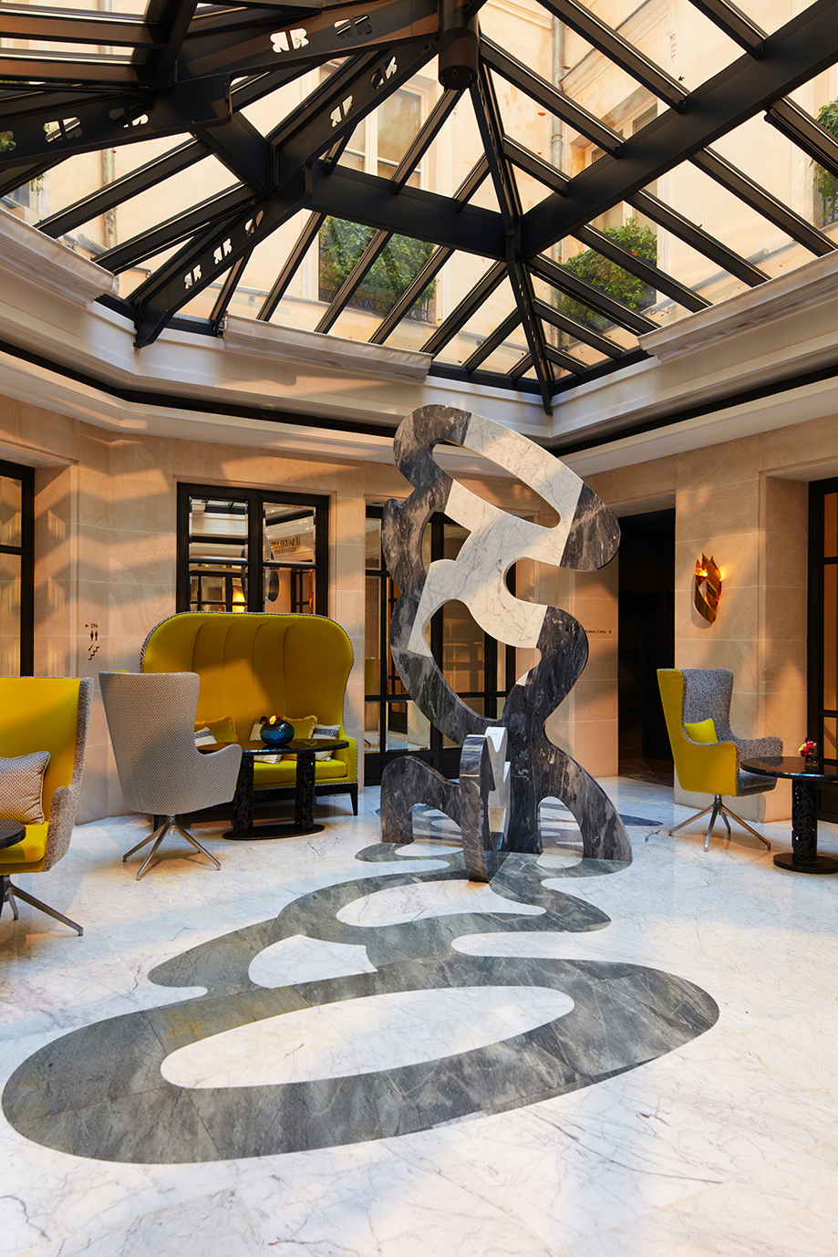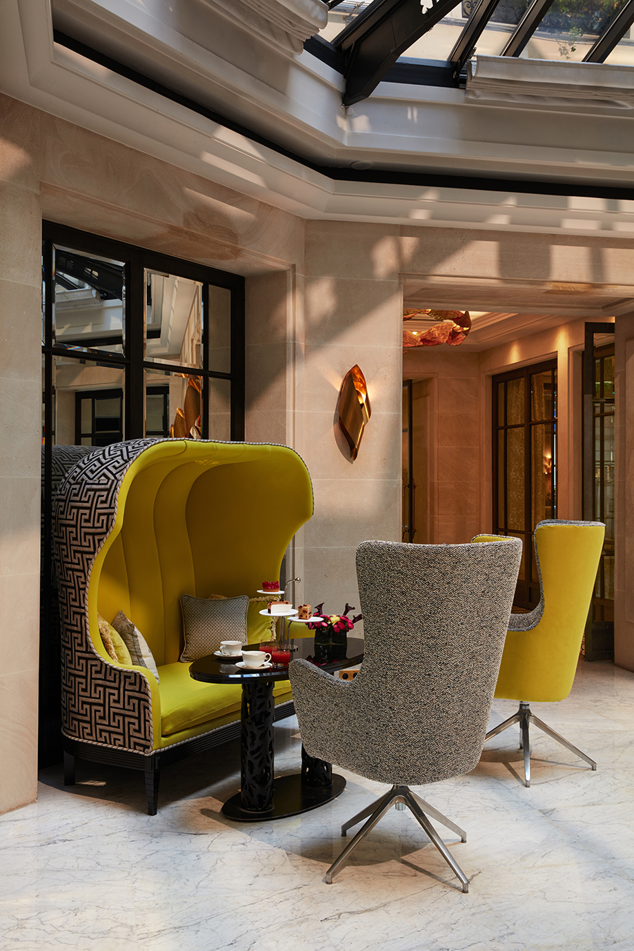 Le Bar affirme sa propre identité à travers un décor éclectique et feutré, signé Patrick Juliot. Dédié au poète romantique Charles Baudelaire, il rend hommage à son œuvre majeure, Les Fleurs du Mal, célébrée au plafond par une fresque monumentale de l’artiste Marco Del Re. Quatre toiles du même artiste, inspirées des muses du poète, ornent les murs et prolongent ce dialogue entre littérature et art.