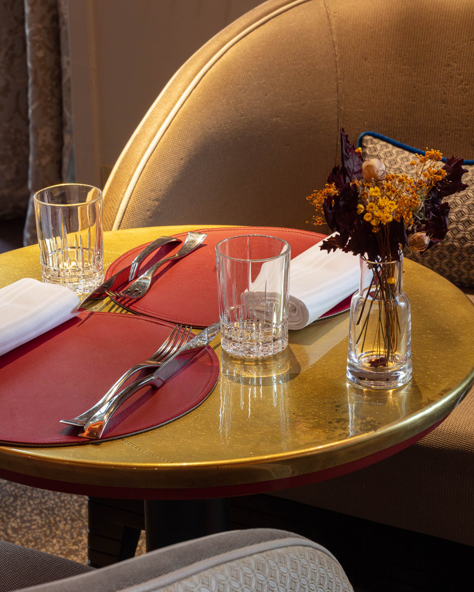 Au centre, un majestueux comptoir doré attire le regard : véritable pièce maîtresse, il reflète la lumière et l’élégance du lieu. L’espace, subtilement divisé en deux ambiances, invite à choisir son moment, côté salon pour une conversation intime, ou près du bar pour savourer l’énergie d’un Paris plus vibrant.