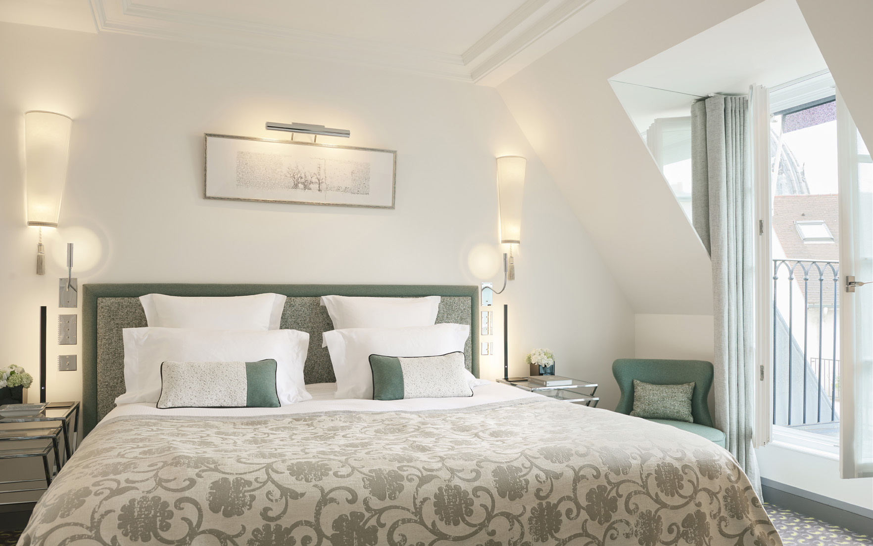 Nichée au 6ème étage, la Suite Vendôme porte bien son nom, évoquant le luxe et l'élégance de la célèbre place Vendôme à Paris. Depuis ses trois balcons, laissez-vous enchanter par la vue imprenable sur les toits de Paris et l'église Notre Dame de l'Assomption, un panorama qui capture toute la magie de la Ville Lumière.